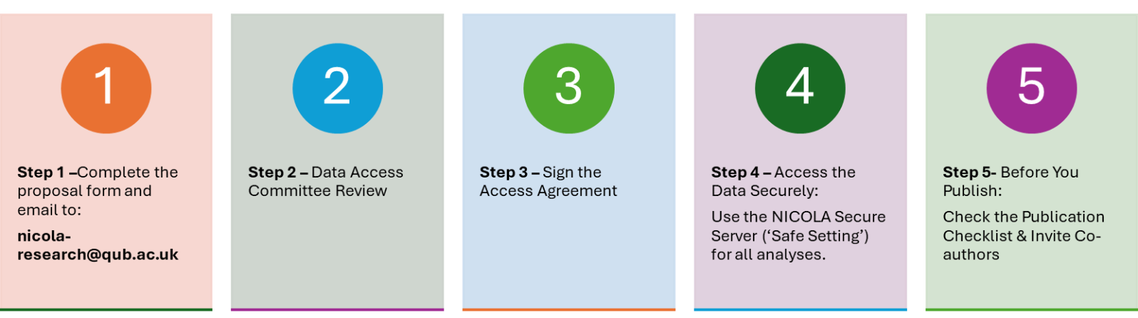 Approved researchers will access data through the NICOLA Secure Server (“Safe Setting”) or approved remote access environment.