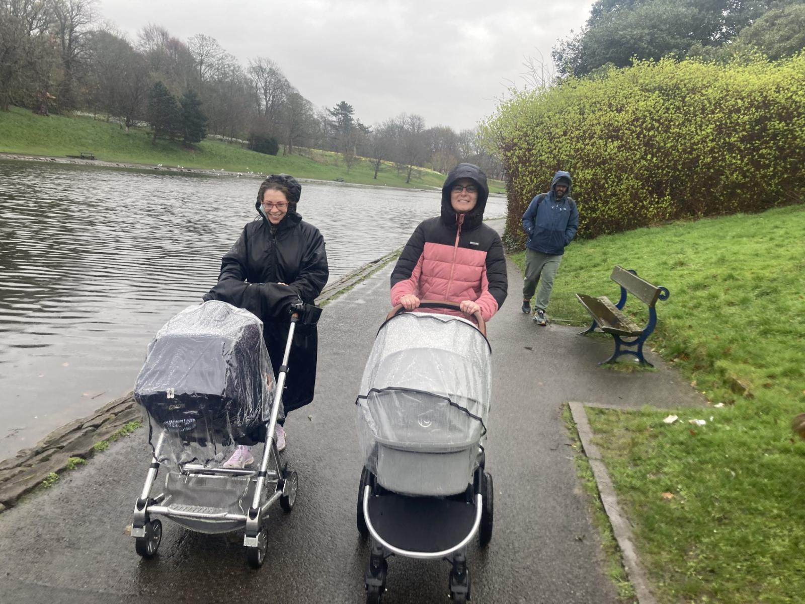 Mums on a walk through a park in Liverpool.