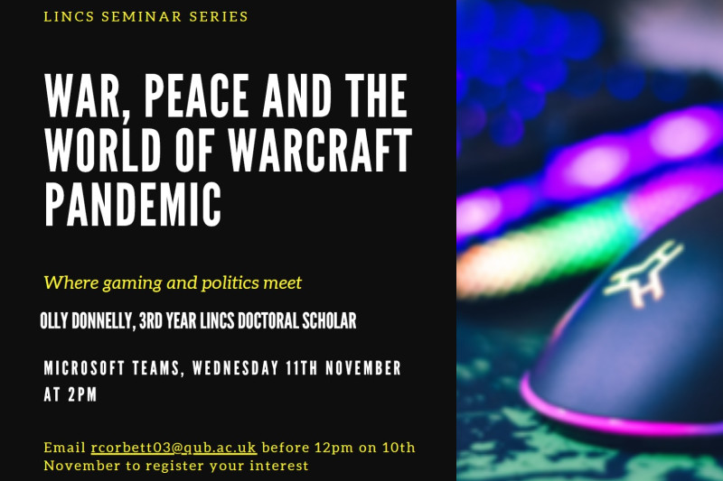 Staff and students are warmly invited to attend our third virtual LINCS seminar series event on Wednesday 11th November. Olly Donnelly, 3rd year LINCS doctoral scholar, will be presenting his work entitled 'War, peace and the World of Warcraft pandemic: where gaming and politics meet'