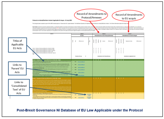 Pending the launch of a dedicated official resource on the EU acts applicable in post-Brexit Northern Ireland, the three-year ESRC-funded research project Governance for ‘a place between’: the Multilevel Dynamics of Implementing the Protocol on Ireland/Northern Ireland for which this explainer has been produced, has developed a freely accessible database that provides links to each applicable EU act as well as the relevant implementing acts adopted by the EU that can be found through the ‘consolidated text’ versions of the original acts. Through the database, the Project is recording additions, amendments, and replacements as well as the deletions and instances where, through expiry, an EU act no longer applies.